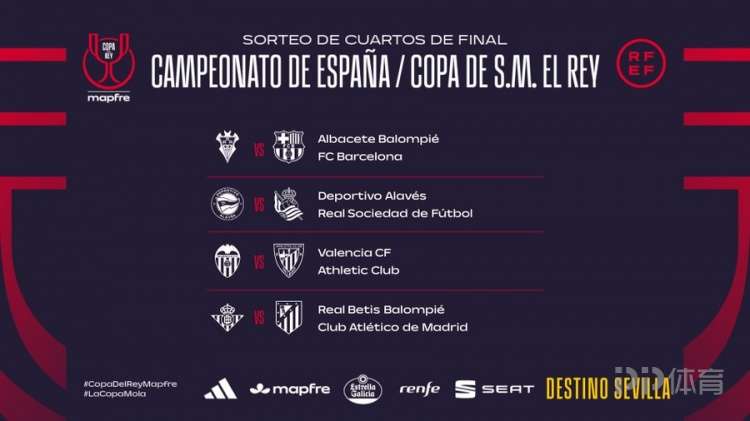 国王杯1/4决赛抽签结果出炉,阿尔瓦塞特对阵巴萨,贝蒂斯对阵马竞。比赛将于当地时间2月3日、4日和5日举行。阿尔瓦塞特vs巴萨阿拉维斯vs皇家社会瓦伦西亚vs毕尔巴鄂竞技贝蒂斯vs马竞 责任编辑: 体育24小时热点