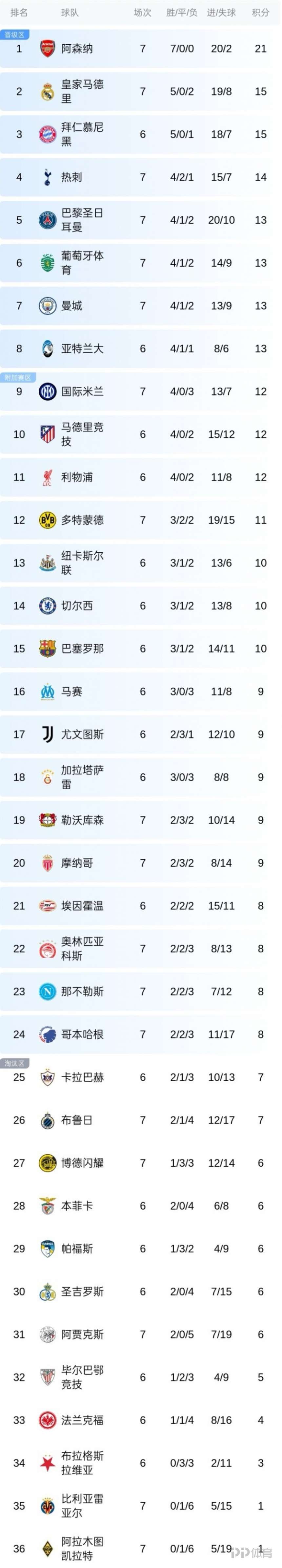 第7轮首个比赛日过后,阿森纳7战全胜领跑,皇马暂升第2,曼城不敌博德闪耀后跌至第7,国米遭遇三连败后跌出前8,暂时来到第9位。