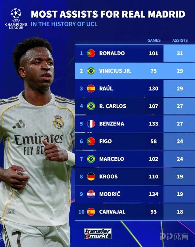 本轮欧冠,皇马6-1大胜摩纳哥,维尼修斯送出2次助攻,根据德转统计,维尼修斯欧冠助攻数升至皇马队史第二。附皇马欧冠联赛助攻榜:1 C罗31次(101场)2 维尼修斯29次(75场)3 劳尔29次(130场)4 卡洛斯27次(107场)5 本泽马27次(133场)6 菲戈24次(58场)7 马塞洛24次(102场)8 克罗斯19次(110场)9 莫德里奇19次(134场)10 卡瓦哈尔18次(93场) 责任编辑: 体育24小时热点