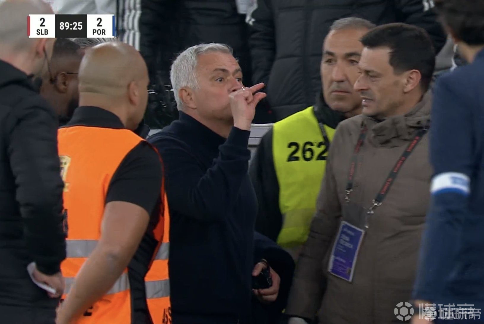事实上,尽管表述措辞不同,但两份报告核心内容一致,且有电视画面佐证,可认定:第91分钟,在其球队扳平进球后,主帅何塞-穆里尼奥离开技术区,跑向对方替补席方向,在中场区域停下,将标志桶旁的球踢向替补席(球低空飞过替补席与附加替补席之间)。这一行为引发对方替补席及补充席位人员的不满——结合比赛发生的背景与时间节点,该举动被视为挑衅——进而导致双方人员发生冲突。”