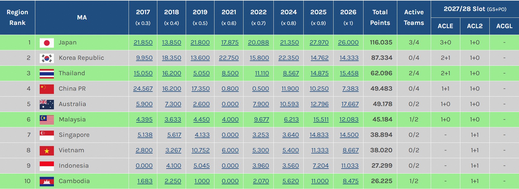 亚冠精英赛八强的东亚区四支球队已尘埃落定。町田泽维亚、神户胜利船、柔佛新山、武里南联晋级。而中超三支球队均在联赛阶段即被淘汰。北京国安也在亚冠二的小组赛阶段出局。目前,中超本赛季亚冠技术积分已滑落至东亚区第10位,被柬埔寨联赛超越。